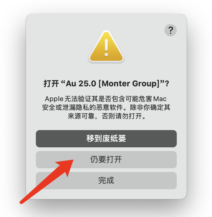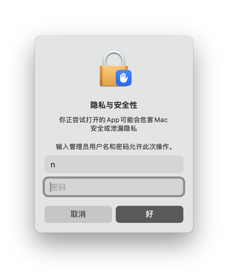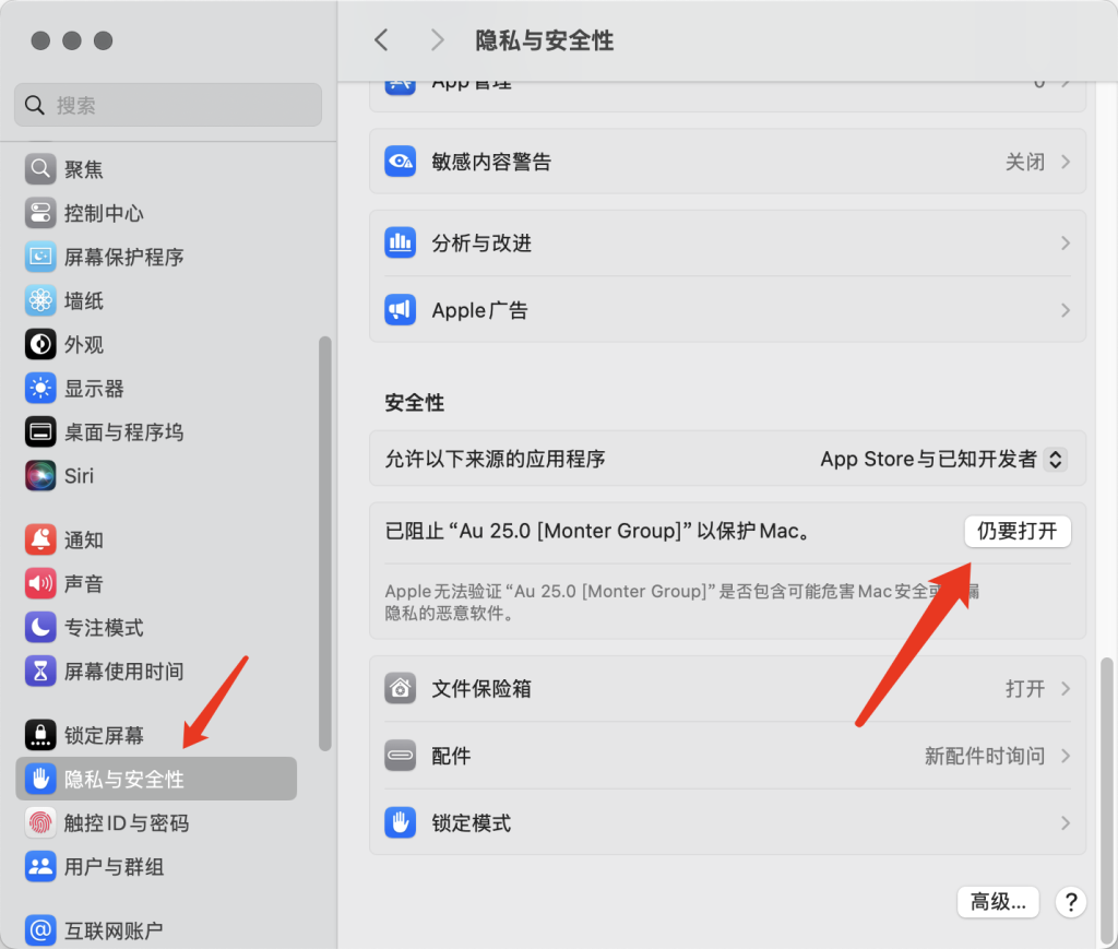 第二步:若弹出此类提示,说明电脑已有操作权限,接下来请进入系统设置,找到 “隐私与安全性” 选项,点击开启对应权限即可(注:这是 Mac 系统自身的权限设置问题,和软件本身无关)。