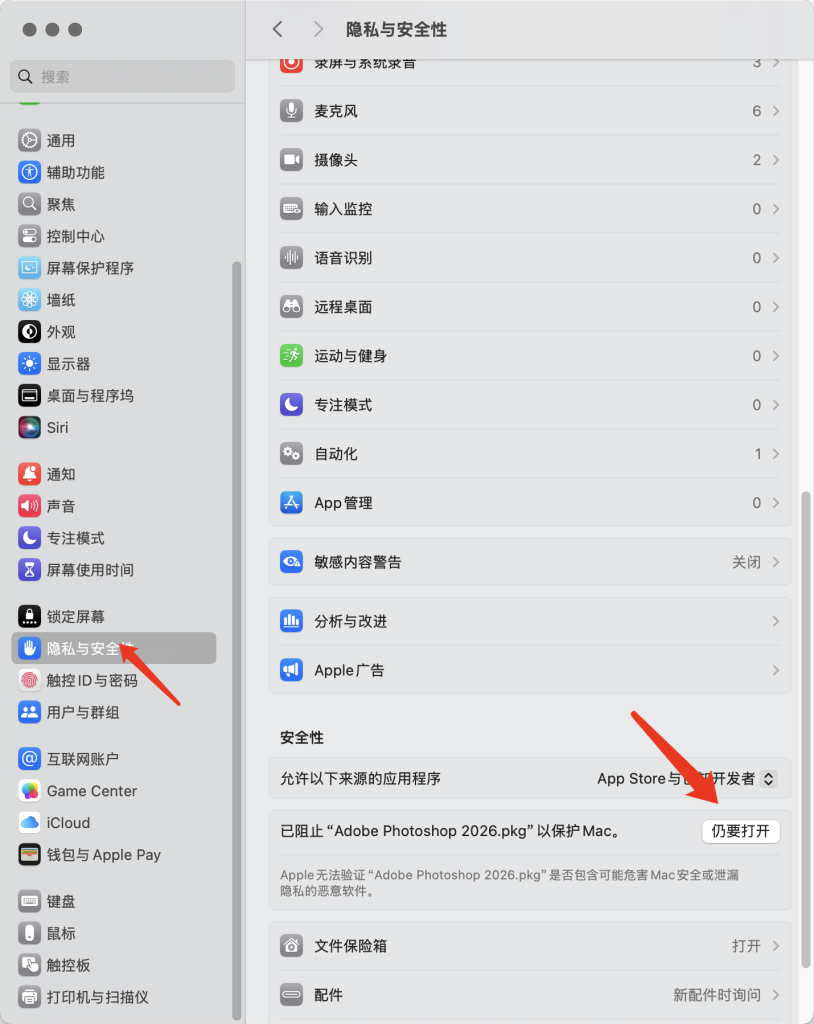 第三,如果弹出这样,就是电脑有权限,去系统设置上点隐私安全点击要打开(MAc系统权限问题和软件无关)。