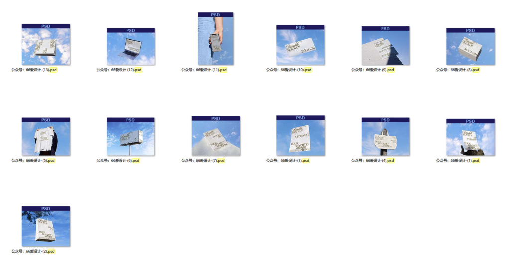 - 13套高质样机:购物袋×3、手机×4、名片×3、T恤×3,场景全覆盖